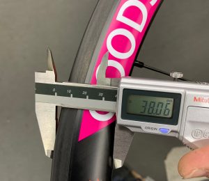 リム高さ38mm、リム幅23mm内幅18mmのワイドリム仕様。25Cタイヤに最適化しています。