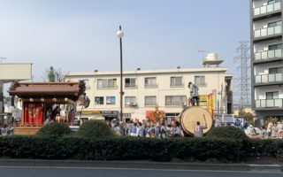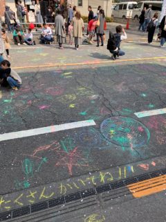 ジェラートを楽しんだ後、今来た道を戻り更に聖跡桜ヶ丘に向かいました。途中太鼓の音がと道路の反対側を見ると大太鼓と山車が春祭りでした。聖跡桜ヶ丘では桜祭りが開催されていました。道路一部閉鎖して子ども達が落書きできるようなスペースになっていて非常に楽しそうなお祭りでした。
