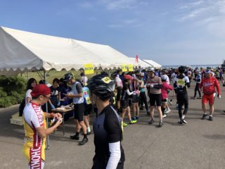 やっと休憩が出来ます。4時を過ぎると210kmの完走車が続々と帰ってきます。中にはママチャリや同じく折りたたみ自転車も帰ってきました。とんでもない人たちですよね。またここでは新潟県内の専門学校の学生さんがマッサージやストレッチを、実習の一環として施術してくれるので非常にありがたいです。