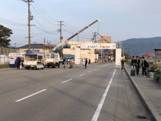 6時ごろ...佐渡ロングライドも終わりの時間になり、ゴールゲートが壊されていきます。日がくれ始め、ホテルまでのシャトルバスが発車する時間になりました。