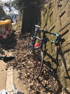 約5kmののぼりです。頑張って登ろうかなーと思った瞬間に後輪に違和感が…。パンクしてしまいました。雨天続きで小石などが路面に流れ出ていた為タイヤが切れてしまいました。
